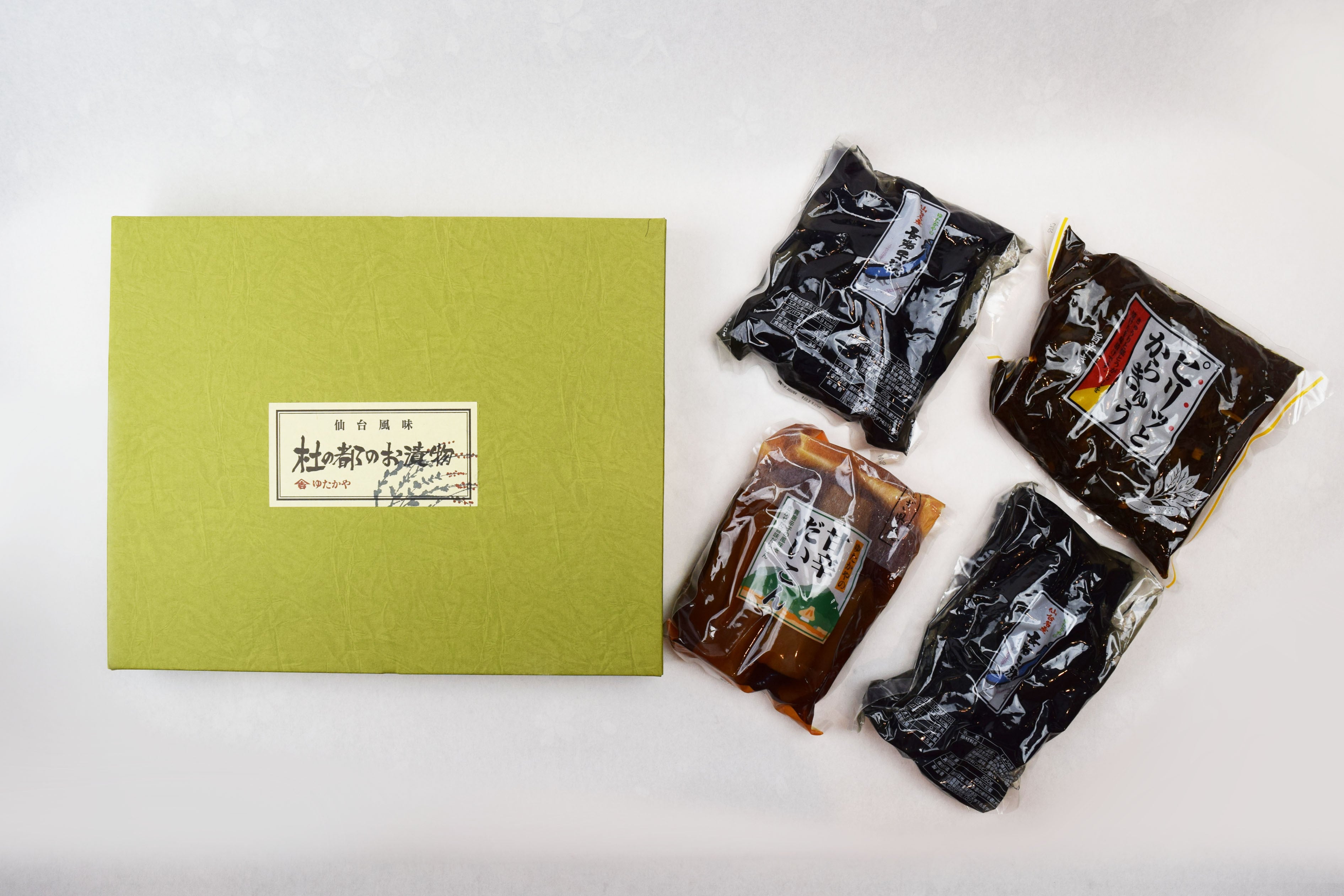 食材王国みやぎを代表する、ふるさとのお漬物4種の詰合せです。親指程の大きさの早取り茄子を使用し、伝統的な製法でつくった「仙台長茄子」をはじめ、パリっとした歯ざわりが人気の「ピリッとからきゅう」、一度食べると病みつきになると評判の味自慢沢庵「甘辛だいこん」が入っており、化粧箱入りですので御贈答用にも最適です。
